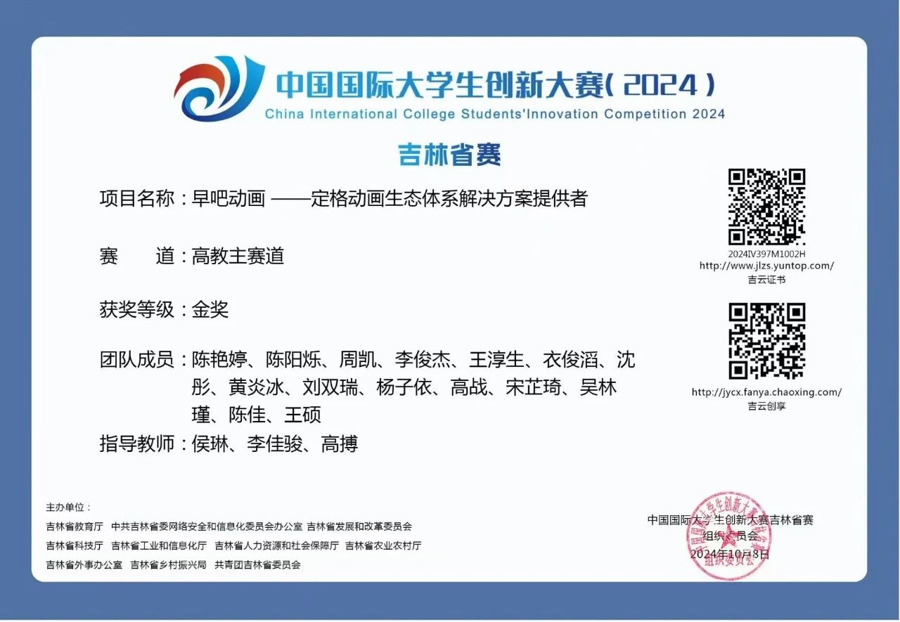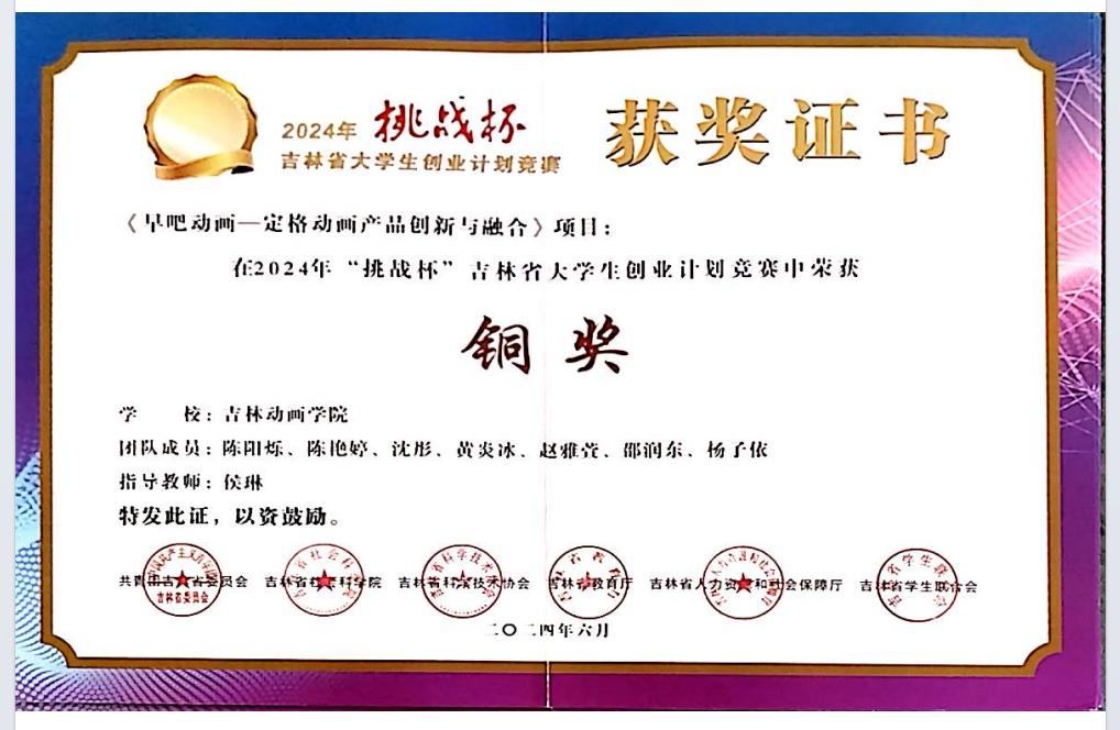 2024年,“早吧动画”项目团队迎来了丰硕的成果。这一年,团队的服务版图持续扩展,先后在各类创新创业大赛中斩获佳绩。团队与北京大学艺术学院合作的《龟壳》项目收获了2024届北京大学MFA最佳毕设入围青年电影节。与北京格拉飞可斯科技有限公司签订3D视频内容创作服务合同。团队成功孵化了《东方》等4个原创IP,这些作品不仅收获了广泛好评,更以创新的形式让传统文化焕发出新的生机。团队斩获多项创新创业领域奖项,孵化4个国家级大创项目,包揽中国国际大学生创新大赛省级金奖、“挑战杯”竞赛省级铜奖及学校“力行杯”创新创业大赛一等奖三重荣誉,实现从校园到省级赛道的阶梯式突破,以硬核成果印证“技术+艺术”双轮驱动模式的创新价值。