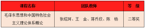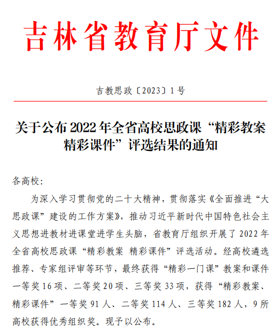 【JAI·赛】潜心耕耘,硕果飘香——马克思主义学院在全省高校思政课“精彩教案 精彩课件”比赛中喜获佳绩 发布时间:2023年01月13日 15:23:00 浏览:次 吉林省教育厅组织开展的2022年全省高校思政课“精彩教案 精彩课件”评选结果近日揭晓,球盟会qmh荣获团队及个人共计8个大奖: 其中王金老师的教案和课件获“精彩教案 精彩课件”类别一等奖;张绍珂、王金、蒋乔欣、陈杨组成团队的“毛泽东思想和中国特色社会主义理论体系概论”课获得“精彩一门课”类别二等奖;刘越、孙建峰、董金芳、张绍珂、朱浩、曹丽丽六位教师的教案和课件获得“精彩教案 精彩课件”三等奖。 一、“精彩一门课”获奖