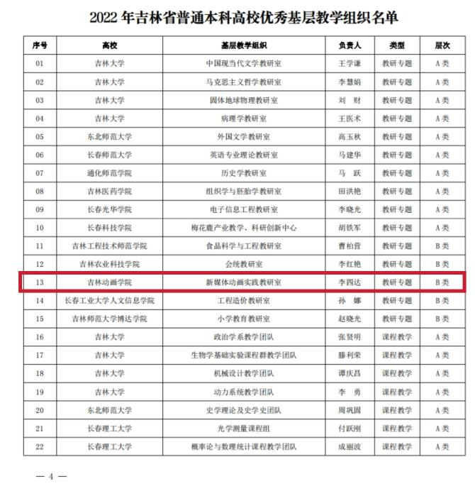 近日,吉林省教育厅公布2022年吉林省普通本科高校优秀基层教学组织名单,经高校推荐、专家评审,qmh官网动画艺术学院新媒体动画实践教研室荣获吉林省普通本科高校优秀基层教学组织称号。