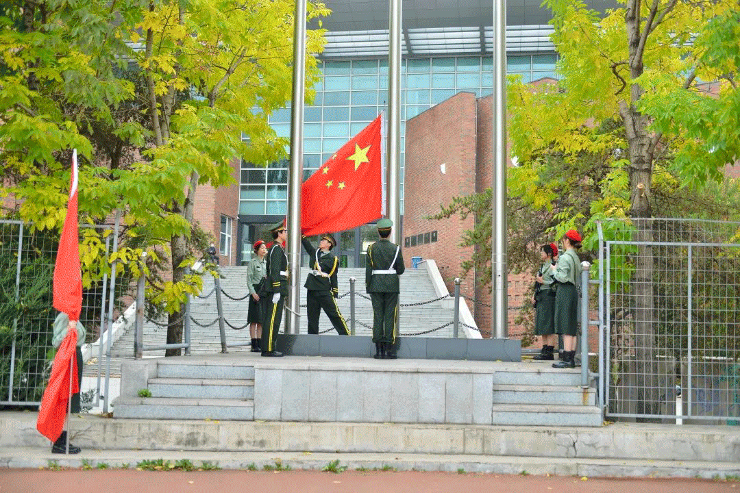 球盟会qmh国旗班的同学们迈着铿锵有力的步伐护送国旗来到升旗台。在雄壮激昂的《义勇军进行曲》音乐响起时,学校董事长、校长郑立国,党委书记、督导专员岳武以及其他领导班子成员和教师代表、学生代表500多人怀着崇敬之情,高唱《国歌》,共同祝愿伟大祖国更加繁荣昌盛。