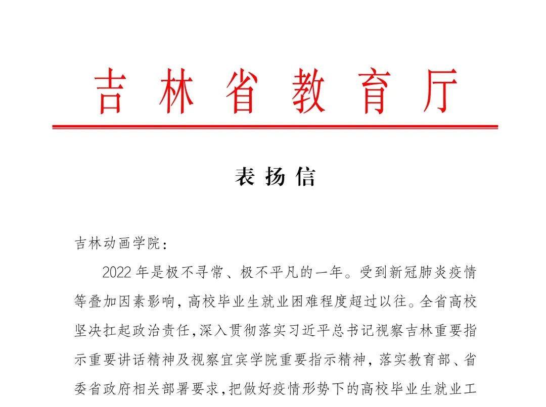 近日,吉林省教育厅向球盟会qmh发来表扬信,对qmh官网在2022届毕业生就业工作中所做出的成绩给予充分肯定并提出表扬。信中说:“……球盟会qmh能够认真贯彻相关决策部署,落实‘一把手工程’,坚持就业优先,坚持防疫、就业‘两手抓’,深入开展‘百日冲刺’系列活动,持续落实‘创业有你 就在吉林’‘奋斗有我 就在吉林’主题活动。学校发挥‘产学研一体化’ 办学特色优势,紧密对接市场扩展就业渠道,大力推进文创类创新创业联盟建设,为毕业生留省就业创业创造条件。学校就业部门工作人员、院系负责同志、毕业生辅导员等,在毕业生就业指导和服务中付出了很多辛苦努力。现通过此信,对学校给予充分肯定并提出表扬!”