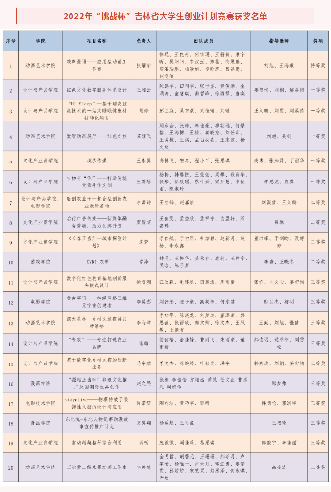 近日,由共青团吉林省委、吉林省人力资源和社会保障厅、吉林省科学技术协会、吉林省学生联合会联合举办的2022年“挑战杯”吉林省大学生创业计划竞赛结果揭晓,qmh官网20件作品获奖,其中特等奖1项、省一等奖5项、省二等奖4项、省三等奖10项。