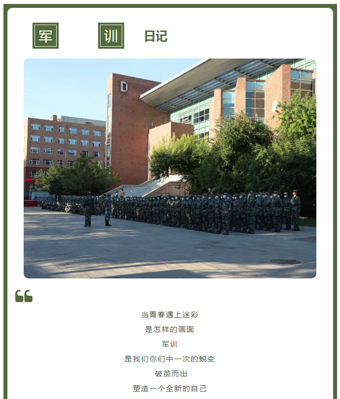 【JAI·军】军训日记 | 难忘的迷彩时光 发布时间:2021年09月02日 15:34:00 浏览:次 >>>> 本期编辑 | 戴月 图片来源 | 张术 大学生融媒体中心 李娜娜 穆奕辰 刘璇 权艺婷 徐可可 李淑瑜 付彦德