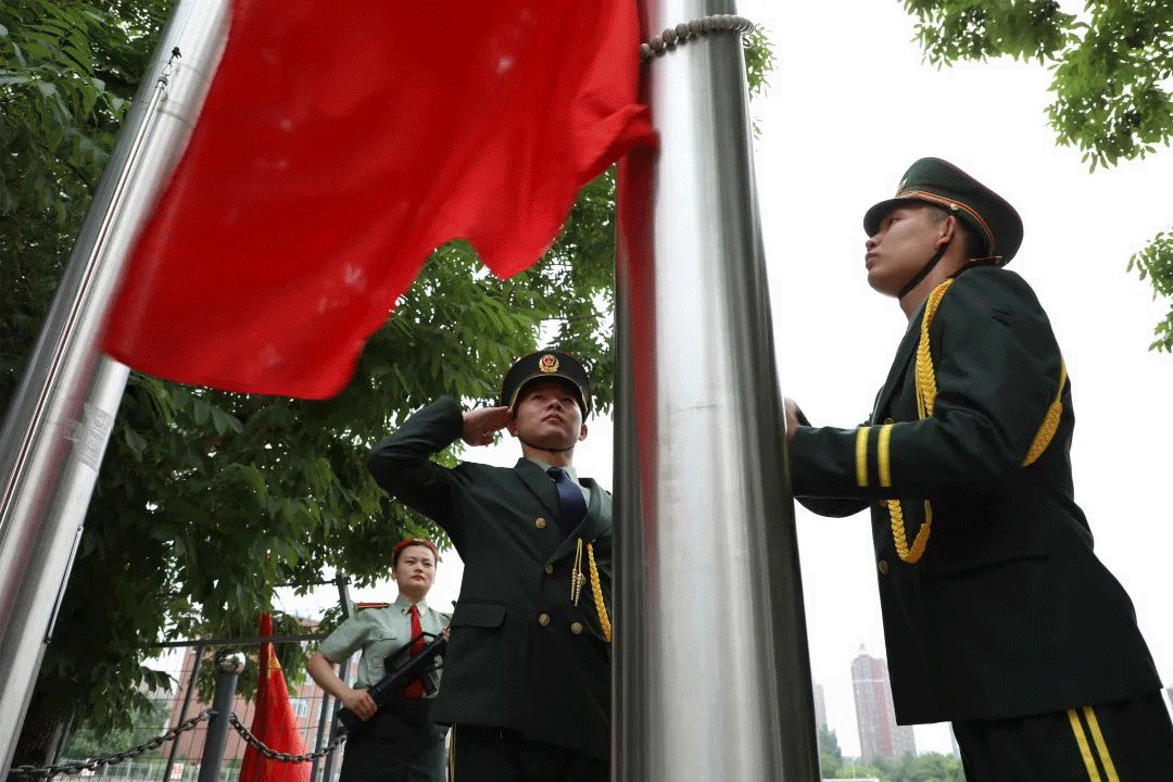 7月1日清晨,雨后的学校体育运动场整洁干净、绿色环绕,球盟会qmh庆祝中国共产党成立100周年升旗仪式,在这里隆重举行。
