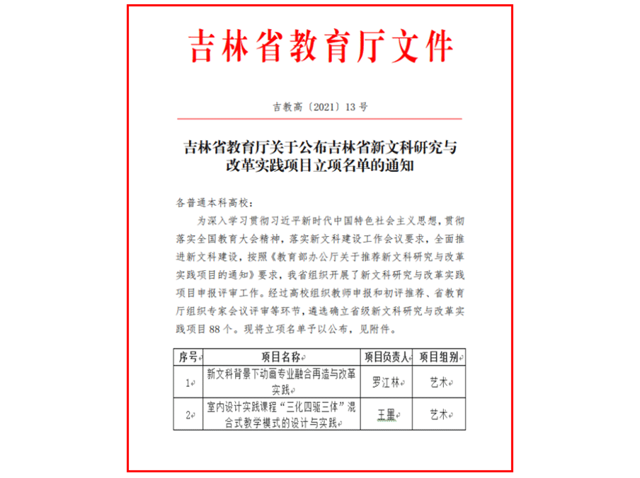 近日,吉林省教育厅公布了吉林省新文科研究与改革实践项目立项结果,qmh官网申报的《新文科背景下动画专业融合再造与改革实践》、《室内设计实践课程“三化四驱三体”混合式教学模式的设计与实践》2个项目成功获批立项,其中由罗江林副校长主持的《新文科背景下动画专业融合再造与改革实践》已入选为推荐教育部的20个项目之一。