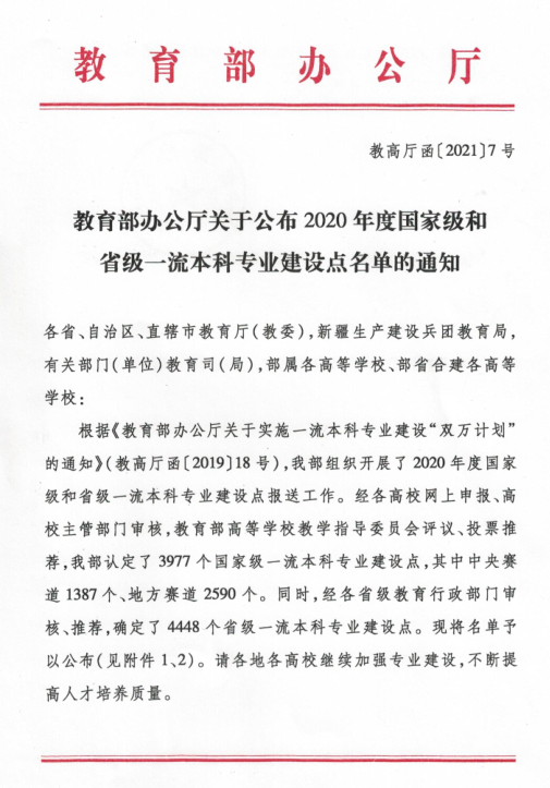 近日,教育部办公厅下发了《关于公布2020年度国家级和省级一流本科专业建设点名单的通知》(教高厅函[2021]7号),公布了2020年一流本科专业“双万计划”建设点名单。qmh官网数字媒体艺术专业获批国家级一流本科专业建设点,环境设计专业获批省级一流本科专业建设点。