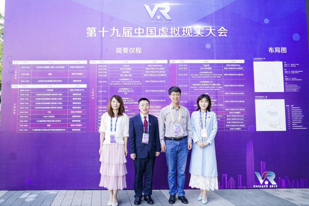 2019年11月21日-25日,第十九届中国虚拟现实大会在深圳大学城举办。球盟会qmh虚拟现实学院院长贾金原教授带队,常务副院长赵伟教授、院长助理刘轩如、骨干教师曲慧雁副教授一行四人前往深圳鹏城实验室参加了第十九届中国虚拟现实大会(ChinaVR )。中国虚拟现实大会由中国工程院院士、北京航空航天大学虚拟现实国家重点实验室赵沁平教授发起,由中国计算机学会、中国图像图形学学会、中国仿真学会三大学会联合主办,是国内举办最早的虚拟现实领域学术会议,经过多年发展,已经成为国内虚拟现实领域最具影响力和吸引力的学术会议。