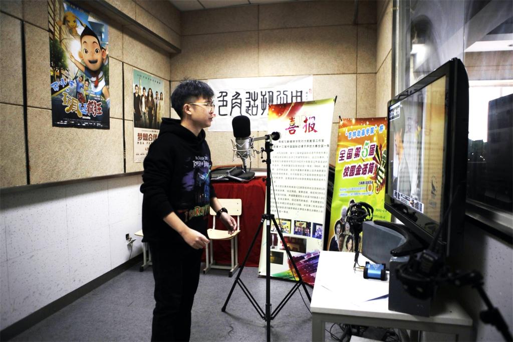 “‘艺术家’!到你了!”被刘大航老师称为“艺术家”的女孩子是电视与新媒体学院播音与主持艺术专业大四学生刘靖宇,她的角色是NPC,类似一个机器人,接受指令完成一些任务。她的声音刚好跟这个角色非常符合,后期也会在电脑中做一下特效处理。刘靖宇从小就喜欢看动漫,特别希望能像动漫片中的角色那样有那些多变的声线,可以出演自己喜欢的动漫角色,她希望今后毕业有机会也可以从事配音工作。