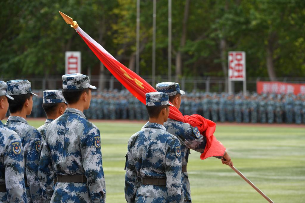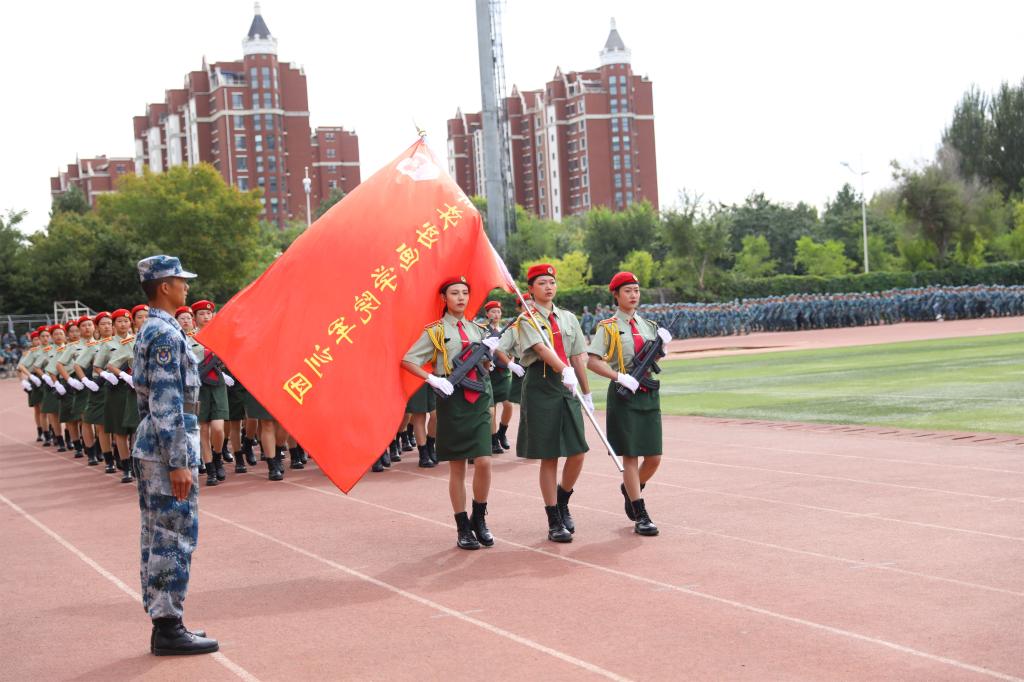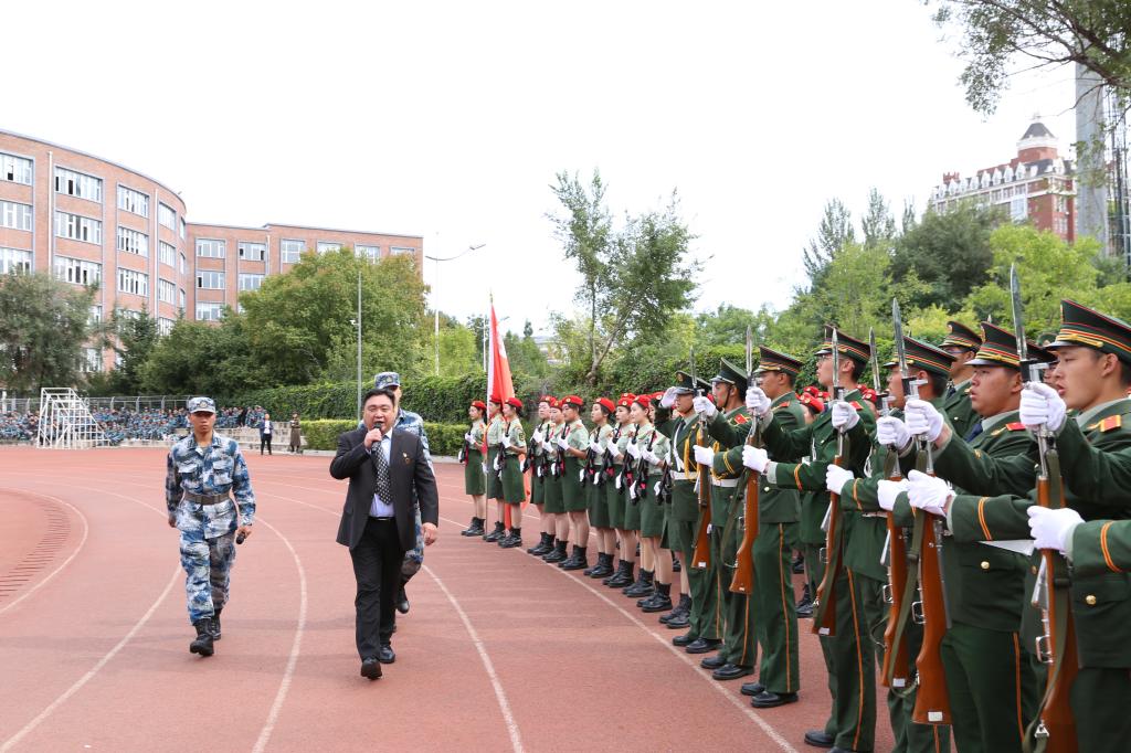 球盟会qmh董事长、校长郑立国,党委书记、督导专员张炬,副董事长、副校长刘欣,副校长王春利、王晓岩、白立明,校长助理彭巍、金鑫,董事会董事张砚为,董事会监事李晶、许小多,中国人民解放军93246部队副旅长李伟上校、管理科长于伟佳中校、管理科参谋曹庆伟中尉,以及学校各学院、部门领导和老师、全体军训教官及2019级全体新生参加了此次活动。