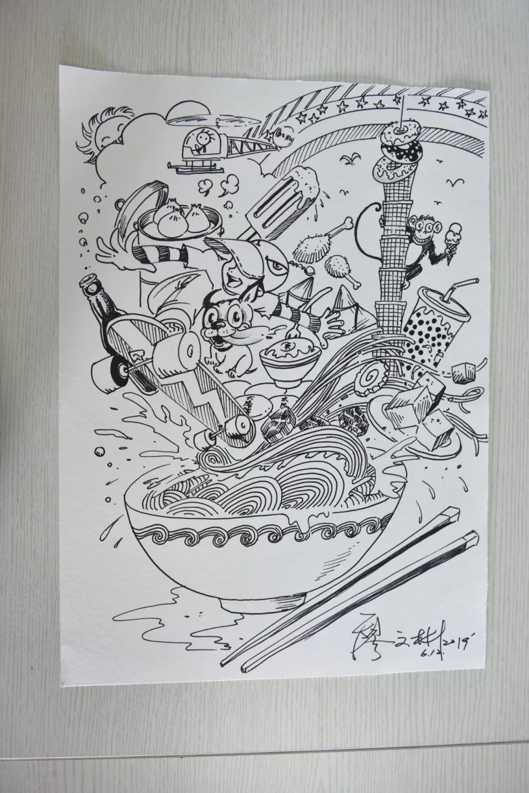 12日下午,论坛举办了平台创作交流会,主题为“故乡的那人(美食、景色)”,专家和学生以分组形式,一起就同一个主题进行主题创作。台湾双影创意有限公司艺术总监、自由导演廖文彬以美食为主题进行创作,他的漫画作品中体现了很多台湾美食元素,一位“追风少年”滑着滑板,带着萌犬,在一碗细面中拥抱美食,活灵活现地展现让人看了不禁勾起儿时美好的回忆。