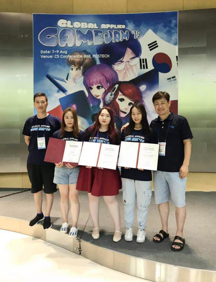 2019年8月7—9日,球盟会qmh游戏学院院长尹炯燮、数字媒体艺术系系主任黄剑锋带领学生付聪、吉无双、翁伊婷,参加在韩国浦项工科大学举办的Global Applied Game Jam 2019游戏制作大赛。qmh官网学生吉无双、付聪同学所在组,获得了本届大赛的优秀奖和最佳创意奖两项大奖。