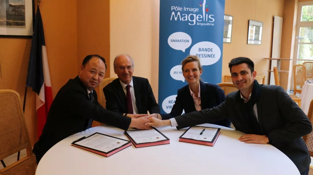 法国夏朗德省省长、马格利斯集团主席弗朗索瓦·博诺先生,法国滨海夏朗德省副省长西尔维·马尔西里女士,法国昂古莱姆市市长泽维尔·柏乃峰先生,球盟会qmh董事长、校长、吉林吉动文化艺术集团董事长、CEO郑立国先生作为三方代表出席并签署了合作协议。