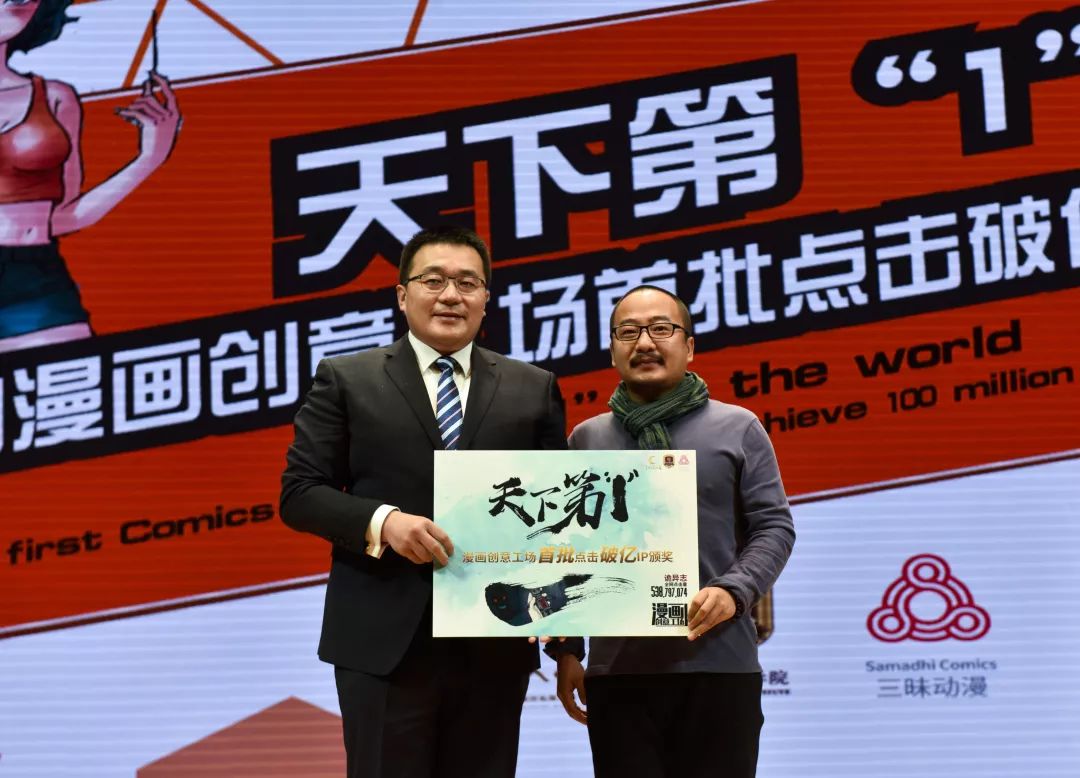 吉林吉动文化艺术集团漫画事业群总经理王立成为漫画创意工场首个点击破亿的IP项目《诡异志》作者代表刘荣颁发奖金