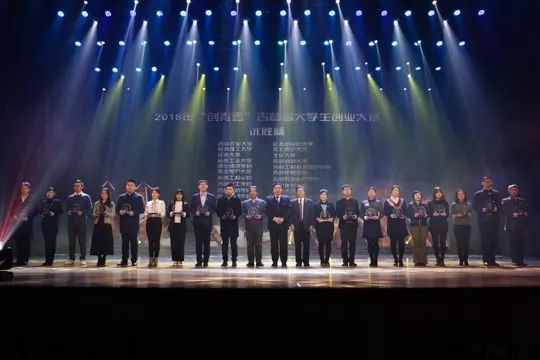 球盟会qmh党委书记张炬和副校长李春义为在2018年“创青春”吉林省大学生创业大赛中获得“优胜杯”的21个学校颁发了奖杯。