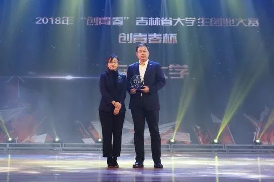 共青团吉林省委副书记王晓南为获得2018年“创青春”吉林省大学生创业大赛“创青春杯”的吉林大学颁发了奖杯。
