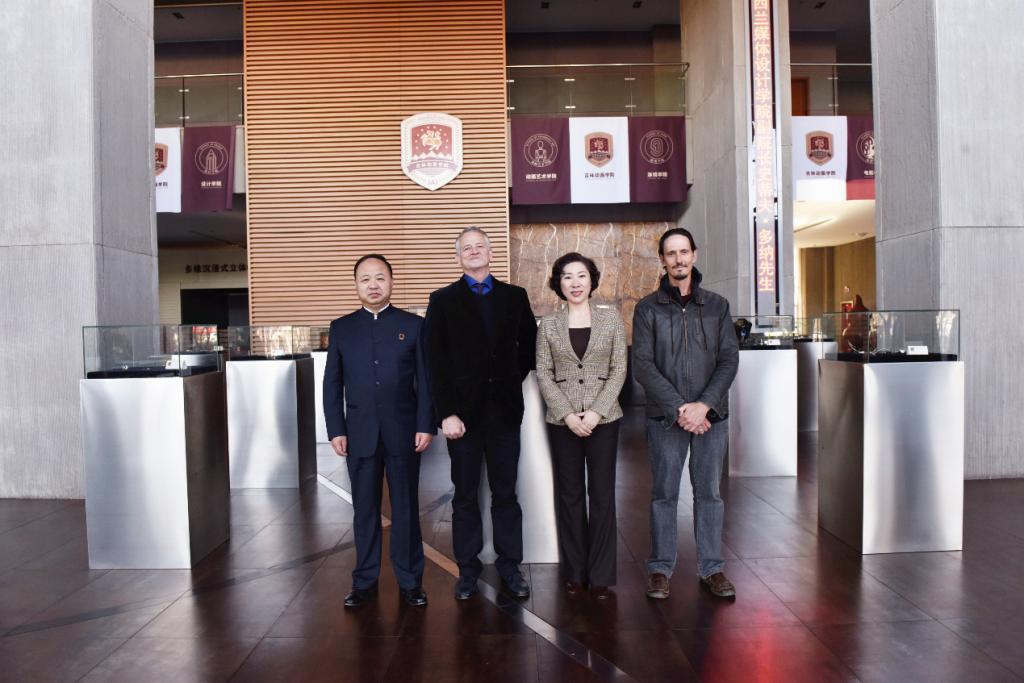 球盟会qmh董事长、校长郑立国与新西兰媒体设计学院副院长史蒂夫•多纳(Steve Dorner)、讲师瑞恩•马拉尼(Ryan Mullany)亲切合影