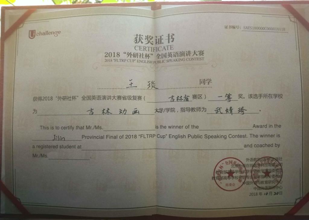 2018年10月20日,“外研社·国才杯”全国英语演讲大赛吉林省赛区复赛在东北师范大学人文学院隆重举行,由国际交流学院选送的qmh官网电影学院16级表演专业的王琰同学凭借精彩的表现在比赛中脱颖而出,荣获吉林省赛区一等奖。