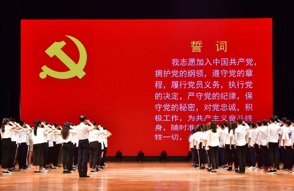 现场,由61名身着白色衬衣、黑蓝裤子组成的党员宣誓队伍,在主持人领誓、引导下,面对党旗举起右拳庄严宣誓。