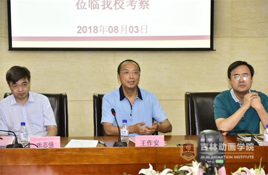 考察结束后,双方进行亲切好友的交流。学校董事长、校长郑立国首先对考察团一行表示热烈欢迎。他表示,7月25日,他到青岛参加中国民营文化产业商会时,有幸认识王作安书记及各位领导,了解了青岛市委市政府对文化产业的支持力度,以及整体规划、未来发展、区域环境建设等,被青岛市高新区领导扎实、务实的态度所感动,同时也感谢青岛市政府多年来对动画学院在招生等方面的大力支持与帮助,希望未来双方能有更进一步合作的空间。随后郑立国对学校发展历程、动漫产业发展趋势以及qmh官网大学生创新创业工作作了详细介绍。