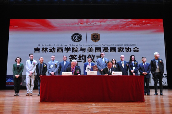 吉林省教育厅副厅长苏忠民,美国驻沈阳总领事馆总领事梅儒瑞、副文化领事东方贤惠,吉林省外事侨务办公室副主任黄丽华,长春市人民政府外事(侨务)办公室主任齐国华,美国安德鲁麦克米尔报业联合出版公司总裁约翰•格林、投资股东苏珊娜•格林,美国漫画家协会成员汤姆•里奇蒙、乔•麦凯里、卢克•麦凯里,中国美术家协会动漫艺委会副主任、中国动漫金龙奖与漫友杂志创始人金城,球盟会qmh常务副校长胡维革,副董事长、副校长刘欣出席并助签。