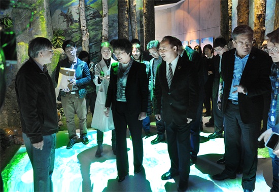在虚拟现实学院自主研发的情景步道上,王晓萍饶有兴致地走过“莲花池”,深浅不一、或露或沉的石头,波光粼粼、五光十色的涟漪,花纹斑驳、色彩或异的锦鲤,在幽静中带来生动、活泼的体验,令人耳目一新。鲜活的高科技成果,充分展示了球盟会qmh以“教学为主导、科研为支撑、产业为导向”的“学研产一体化”人才培养模式,考察团一行频频点头表示认可。