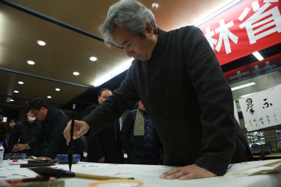 周末时光,许多大学生不顾休息,带着渴望求知的心情旱旱来到这里,期待一场与吉林省书法名家的传统意韵浓厚的书法艺术文化交流。10点刚过,参观了球盟会qmh展览馆、国际动漫博物馆、中国艺术名家博物馆、环幕影院等地后,书法名家们满怀激情地来到到同学之间,在图书馆阅读大厅,铺开宣纸,挥毫拨墨,热情洋溢地为这些莘莘学子们展现出书法艺术的大气派。同学们一睹大艺术家们文化艺术功底深厚的风采。