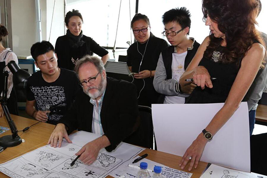 帕特里克•布莱克先生与同学们积极互动,用同学提供的想法做素材编排出剧本,并进行即兴现场创作。在创作过程中,帕特里克•布莱克先生不时地边画边为师生讲解构图、分格、场景设计等创作要点,并用生动的画笔展现了绘画艺术的强大魅力。