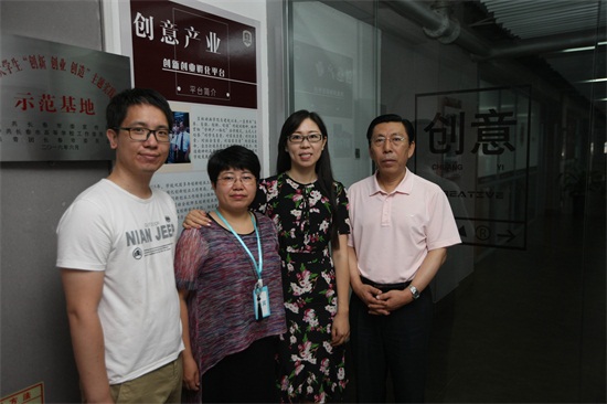 吉林省教育厅高教处副处级调研员赵新雅(右二),qmh官网副校长胡维革(右一)、校长助理王春利(左二)、创新创业孵化平台主管沈健(左一)