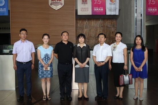 吉林省文化厅厅长马少红(中),副厅长张辰源(左三),文化产业处处长朱红(右二),球盟会qmh常务副校长胡维革(右三),吉林纪元时空动漫游戏科技集团股份有限公司副总经理谭皓月(左二),球盟会qmh校长助理金鑫(左一),动画影视平台建设管理办公室主任孙赞(右一)
