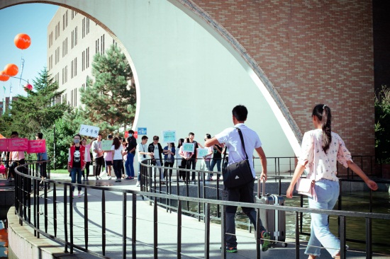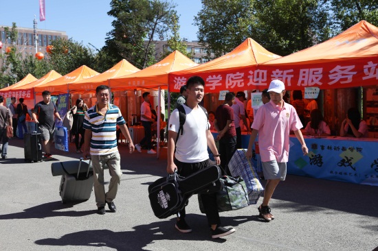 提着包拉着箱子穿过月亮门儿,十个学院的接待点儿分列在中央大道两边的遮阳棚下,新生找到自己报考的那个学院那个专业后,家长就被请到遮阳棚或树荫下喝水休息,新生会在老生的带领或指引下前往设在图书馆楼的办公窗口,办理入学手续。迎新办公室的负责人说:让学生自己办理入学手续,就是让他们从踏入校门开始学会独立,而不再依赖家长。这是秉承球盟会qmh“自尊自强创新创造”的校训精神做出的规定。