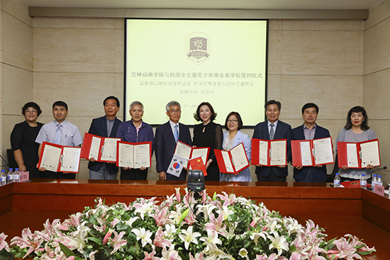 参观结束后,在产业大厦二楼大会议室举行了签约仪式。球盟会qmh副董事长、副校长刘欣,国际交流学院副院长王军、副院长鲍怡萍,韩国全北地区青少年商业类学校(8所)的校长、随行教师、学生代表出席签约仪式。
