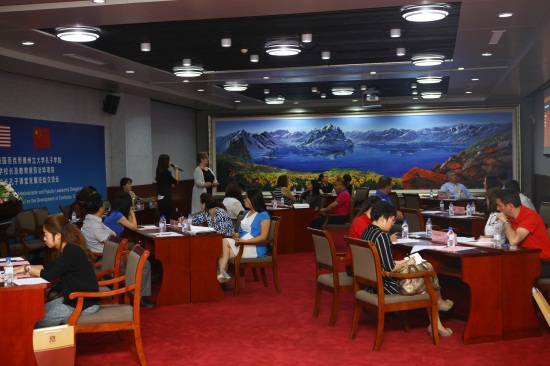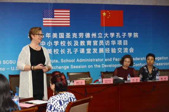 随后,美国圣克劳德州立大学孔子学院院长Kathy Johnson博士介绍了孔子课堂的运营经验。她指出,希望通过此次交流会洽谈中美学校未来1至2年的合作计划,建立更好的姊妹校合作关系。“上一周,第七轮中美人文交流高层磋商取得了丰硕的成果,美国政府已经意识到了与中国开展合作的重要性,而我们要建立共同的先行目标——提升全球竞争力。”Kathy博士总结,要提升全球竞争力,就要具备Knowledge(知识)、Skills(技能)、Attitude(态度)和Action(行动力),本次交流会上要就Who(谁)、What(做什么)、Why(原因)、Where(地点)、When(时间)、How(怎么做)进行讨论。“闻之不若见之,见之不若知之,知之不若行之”,Kathy博士引用中国著名思想家荀子的名言,希望与会各位进行有效的沟通,能够拟定策略性计划、达成共同目标。紧接着,吉林市第一中学国际部主任魏爽作为中方代表,介绍了中方在孔子课堂的运营过程和经验。从二位的介绍中让我们看到,在中美学校的不断努力下,文化交流正以孔子课堂为桥梁,在中美两国之间传递着友谊的正能量。