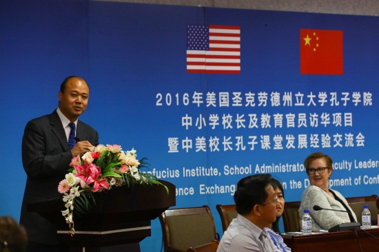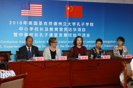 6月12日9时,2016年美国圣克劳德州立大学孔子学院中小学校长及教育官员访华项目暨中美校长孔子课堂发展经验交流会在qmh官网艺术中心三楼长白山厅举行。吉林省教育厅国际合作与交流处处长胡仁友,美国圣克劳德州立大学孔子学院院长Kathy Johnson、周立新,球盟会qmh副董事长、副校长刘欣,吉林市第一高级中学国际部主任魏爽,美国中小学校长及教育官员,以及吉林省内部分中小学代表参加了交流会。