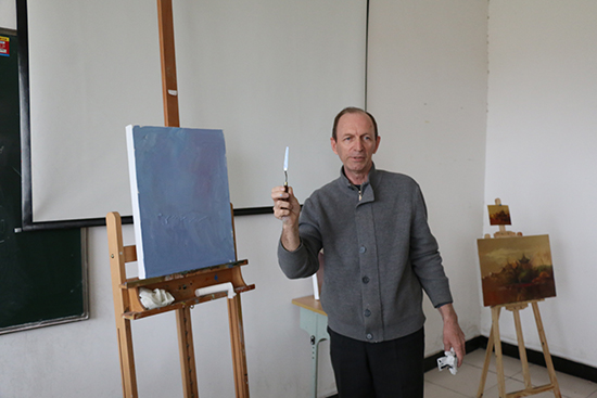 讲座结束后,同学们纷纷赶往阿纳托利教授所在工作室观看他的现场创作,教授对同学们的求学精神表示赞赏,为同学们演示、讲解了近两个小时。通过本次讲座,同学们亲身体验了俄罗斯传统风景油画的创作过程,大家表示,这对提高绘画技能和专业知识具有极大的帮助。