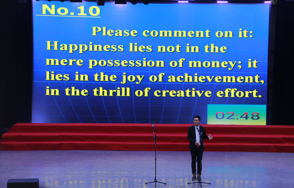 在命题演讲、即兴演讲及问题回答等环节的比拼中,qmh官网电影学院2013级影视戏剧美术设计专业周筠杰同学以其流畅的英语表达、稳健的台风、机敏的反应给评委和观众留下了深刻的印象,荣获吉林省赛区一等奖。