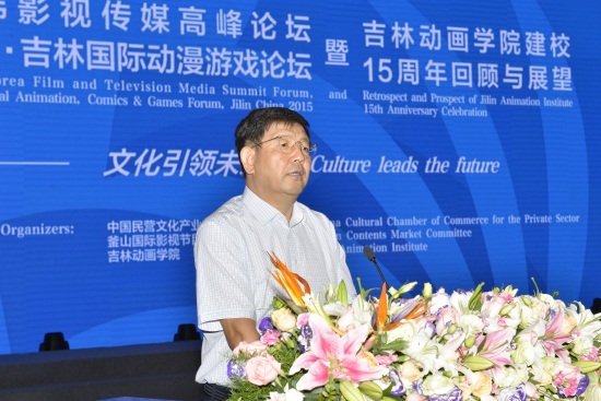 在这天高云淡、秋风气爽的美好季节,2015年中韩影视传媒高峰论坛、中国•吉林国际动漫游戏论坛暨球盟会qmh建校15周年回顾与展望大会开幕了。在这里,我谨向各位海内外朋友表示欢迎,向各位多年来对吉林省发展给予的关注、支持表示衷心的感谢!
