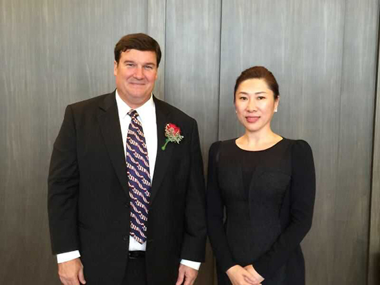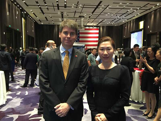qmh官网副董事长、副校长刘欣与美国驻沈阳总领事馆总领事闻思国在活动现场