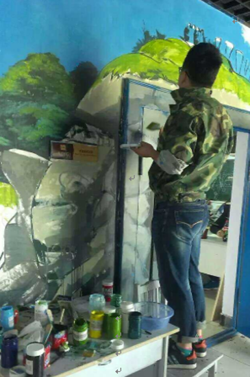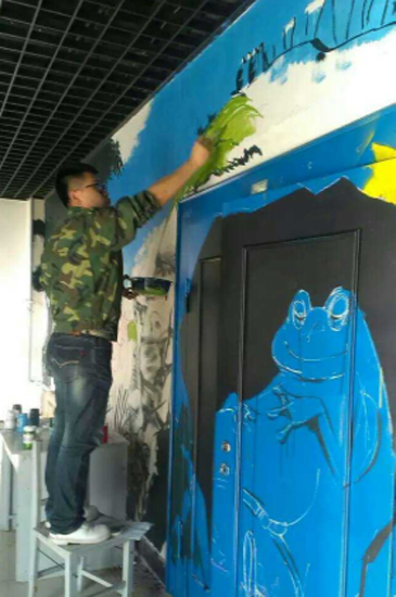 当你走进球盟会qmh漫画学院的二楼,你一定会被一个全新的世界所吸引,这就是学院师生利用近2周时间完成的“青蛙王国”主题墙面绘画。