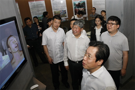 球盟会qmh党委书记王清山、吉林纪元时空动漫游戏科技股份有限公司副总经理蒋平陪同吉林省发改委主任姜有为一行参观学校校史馆
