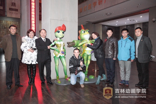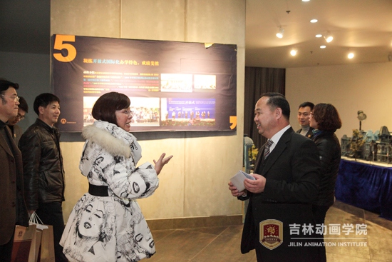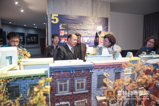 郑立国董事长陪同客人参观了产业大厦2层的动漫分院展厅。