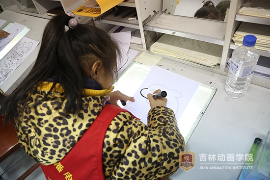 随后,小记者团走进动画楼动画教室,分成两个班感受透台动画的制作过程,现场动手运用透台进行动画创作,感受线描课。由学习部副部长郭勇良、赵德宇客串一日老师,细心地为小朋友们讲解运用透台进行绘画的基本要求及运用透台绘画后所产生的效果,手把手教小朋友们在透台上画画。并讲解了早期产生动画效果的生命之轮和手翻书的绘制过程及产生动画效果的原理,为小朋友们讲解了视觉残留原理并逐个展示了动漫分院的哥哥姐姐们绘制的手翻书,看到一张张单独的画组成了一个动起来的画面,小朋友们都特别开心,频频发出惊叹的声音。