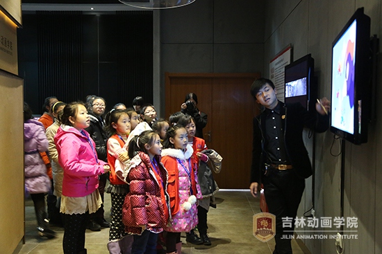 工作人员向小记者们介绍我院自主创作的动画片