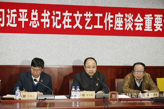 他说,要从历史意义和现实意义深刻理解《习近平在文艺工作座谈会上的讲话》精神。习总书记这次讲话,是72年前毛泽东《在延安文艺座谈会上的讲话》精神的继承和发展,具有时代的延展性和现实意义。董事长从学院发展定位和办学特色进一步明确了:文艺要为人民服务,为社会主义服务。艺术创作要来源于人民,来源于生活。艺术家要做到德艺双馨。文艺作品不能过多的注重经济效益,忽略社会效益。