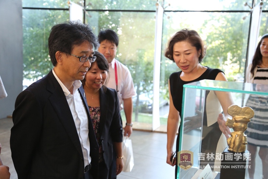代表团在副董事长刘欣、国际合作与交流中心副主任鲍怡萍的接待陪同下,参观了学院的校史馆、博物馆,观看了学院宣传片。刘欣副董事长向代表团介绍了学院的组织结构图、学研产一体化人才培养模式,说到:“学院实行董事会领导下的院长负责制,同一董事长,不同董事会,分别管理学院和公司。学生在大三期间进入工作室和产业公司实习,提高了实践能力,得到用人单位的青睐。”森谷邦彦局长了解了我院的办学模式、就业情况后连连赞叹说:“非常了不起啊!”进入二楼博物馆展厅,代表团饶有兴致地欣赏着众多珍贵的作品手稿,在看到迪斯尼展区的《米老鼠和唐老鸭》时,在看到定格动画作品《礼物》的乡村农家小院场景时,在看到市面上几乎很难买到的多款老式游戏机时,森谷邦彦局长颇为感慨:“好怀念啊!能在这里看到。”