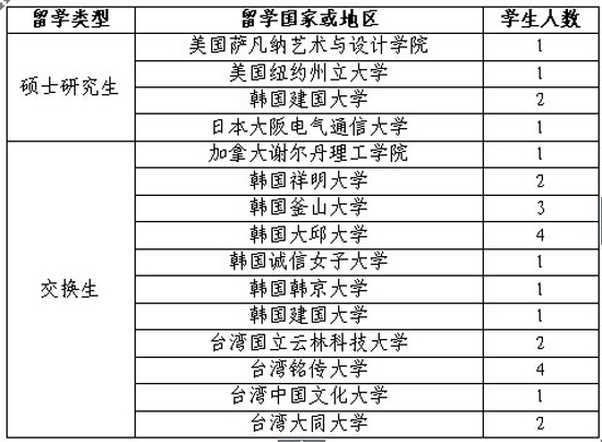 随着学院国际合作与交流工作不断深化和发展,越来越多的学生选择赴国(境)外交流学习。学生通过报名、院系批准、申请院校考核等阶段,下学期,共选派27名学生赴国(境)外学习。其中5名学生赴国外攻读硕士研究生,分别是赴美国萨凡纳艺术与设计学院学生1名、美国纽约州立大学1名、韩国建国大学2名、日本大阪电气通信大学1名;22名学生交换学习半年或一年,分别赴韩国祥明大学、加拿大谢尔丹理工学院、台湾国立云林科技大学等大学。