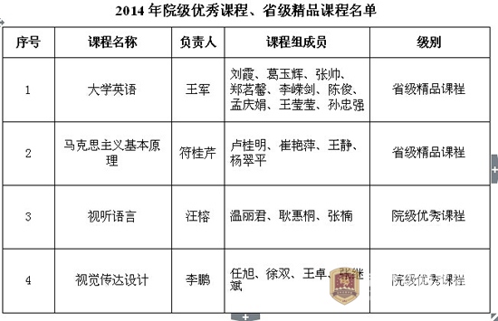 2014年学院组织开展了院级优秀课程评审和省级精品课程推荐申请工作。其中传媒分院的《视听语言》、设计分院的《视觉传达设计》两门课程被评为2014年度院级优秀课程。根据吉林省教育厅近期下发的文件通知获悉,我院外语教学部的《大学英语》、思政教学部的《马克思主义基本原理》课程,获2014年度吉林省高等学校本科精品课程殊荣。