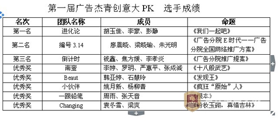 经过比赛激烈的角逐,来自2012级李豪、胡玉佳、彭静团队《“我们一起吧”广告分院推广方案》取得比赛的第一名,2011级《广告分院E时代全国网络推广方案》《“发泄创意 动荡不羁”广告分院推广方案》分获二、三名的好成绩。