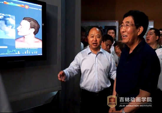 学院和吉林禹硕公司承担的国家科技部科技支撑项目《禹硕数字动画制作面部表情捕捉系统》的现场演示,让大家颇感兴趣。一个复杂的动画人物表情,手工制作需要两天时间,《禹硕数字动画制作面部表情捕捉系统》,只用一分钟就能够完成,解决了国内动画制作的高难课题,其市场前景不可估量。随即,巴音朝鲁省长兴致勃勃地站在该系统屏幕前做了一个表情。果然,顷刻间看到了自己被捕捉的动画形象。引起场内一片热烈的掌声和笑声。
