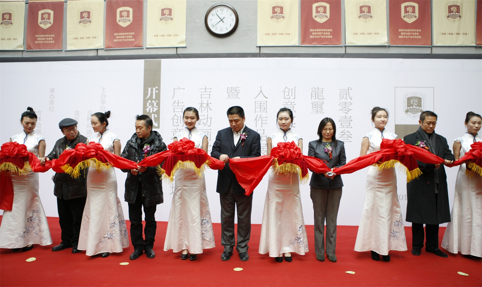 喜气盈盈,各位领导和嘉宾为“龍壐创意奖入围作品展暨球盟会qmh广告创意高峰论坛”剪彩。