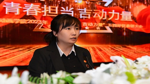 张砚为代表学校党委向一年来在学校团学工作中涌现出来的先进集体和先进个人表示热烈的祝贺!并对广大吉动学子提出三点殷切希望,一是希望同学们有理想有情怀,做中华文化传承的捍卫者。二是希望同学们有方向有规划,做引领未来的开拓者。三是希望同学们敢担当勇创新,做勇立潮头的践行者。